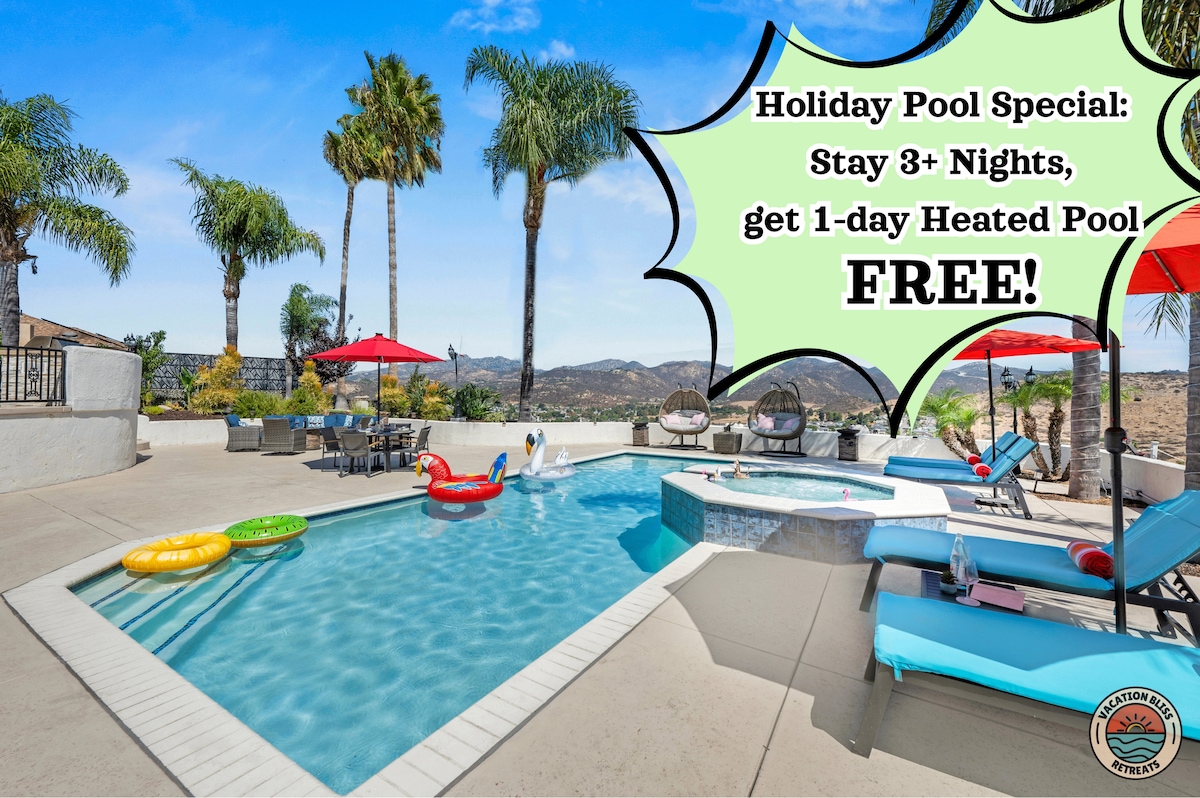 Pool heating takes up to 10 hours to reach 82°F and must be requested in advance, ideally at the time of booking. Payment must be made before heating begins. Any tampering with pool equipment will result in a $1000 fine.