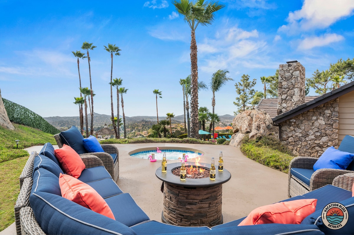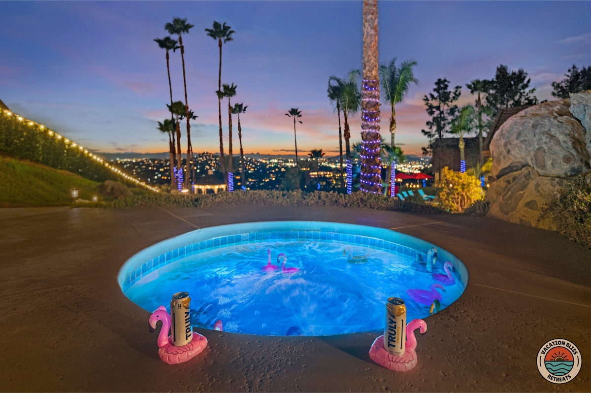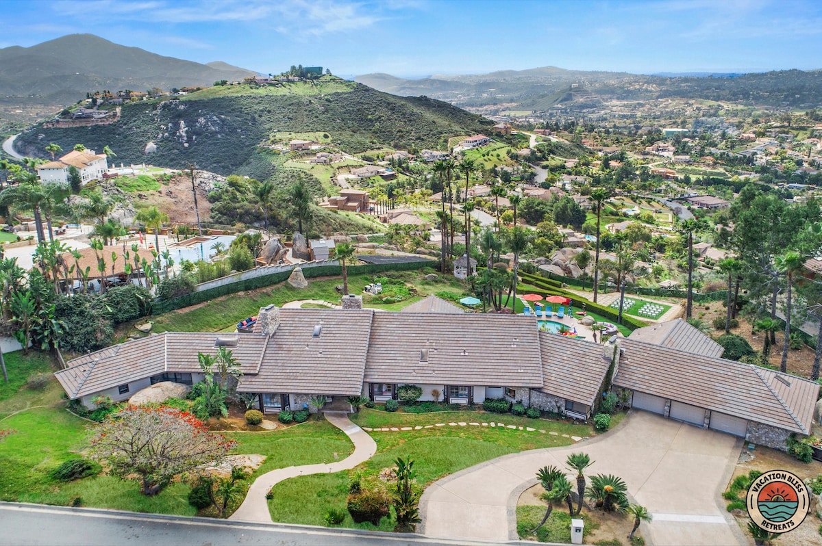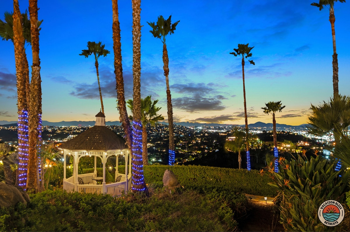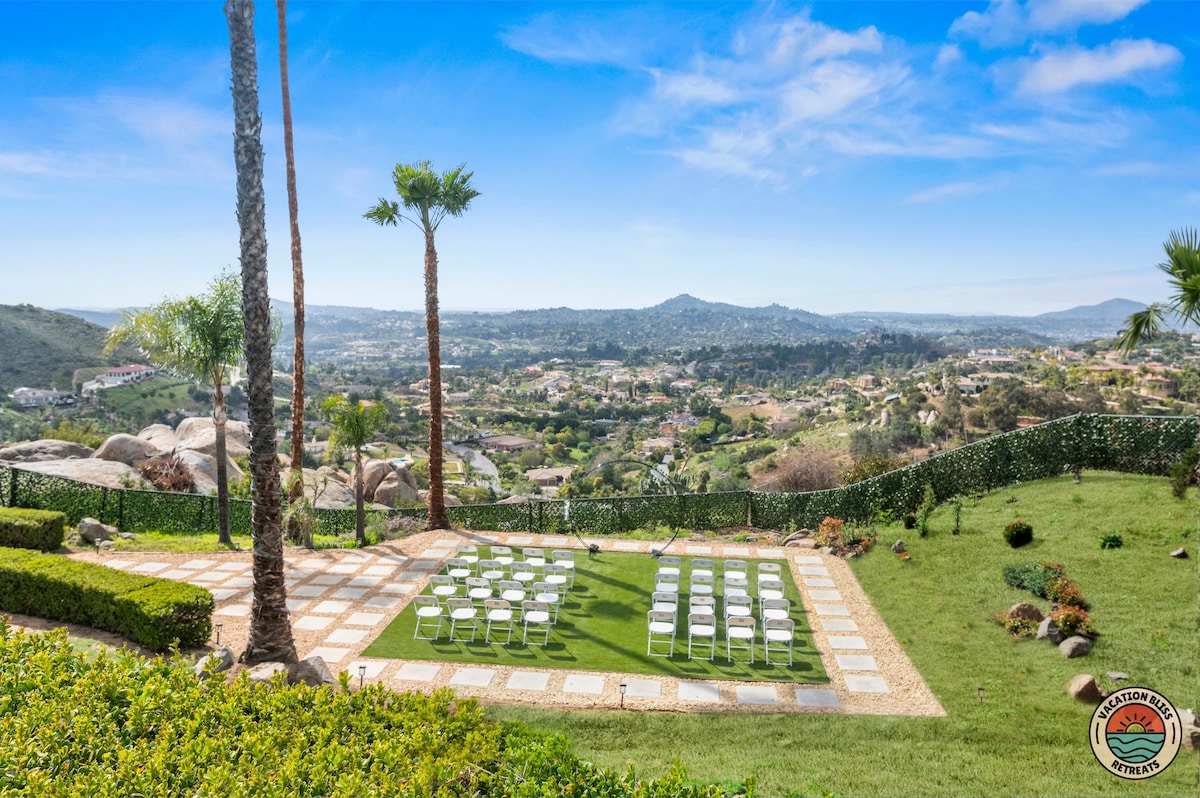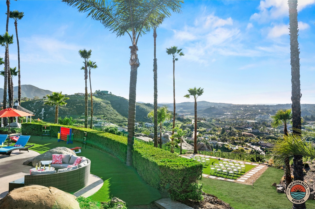 El CajonHost your next getaway or intimate wedding at this hilltop mansion in El Cajon! Enjoy stunning views of the mountains, city, and OCEAN from this one-of-a-kind estate. With a pool, spa, two game rooms, gym, huge backyard, and a special spot to say "I do," it’s perfect inside and out. You'll have 4,500 sq. ft. of space, 6 bedrooms, 18 beds, stylish finishes, a chef’s kitchen, indoor bar, and unforgettable sunsets-plus views that stretch all the way to Coronado Island! We can’t wait to host you!